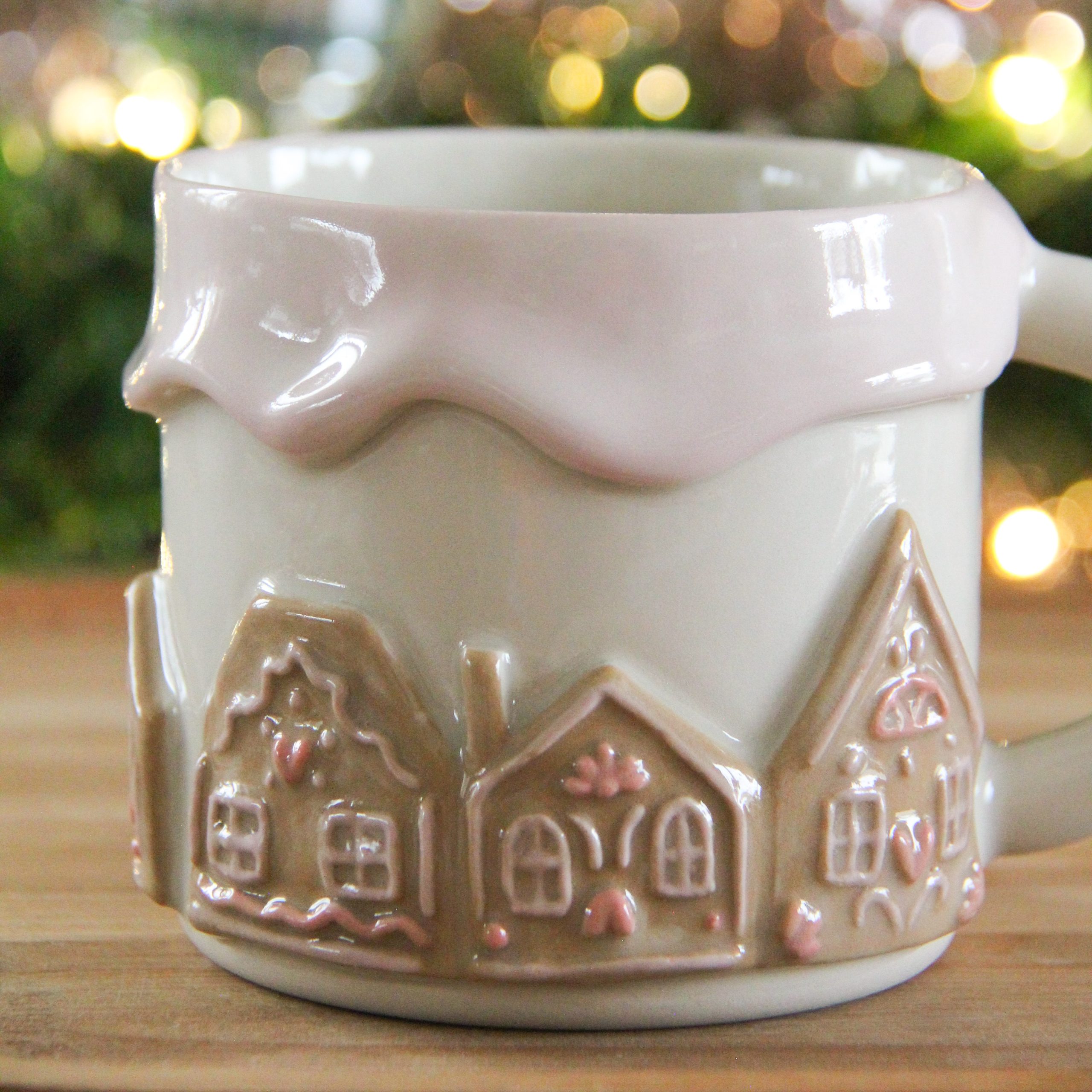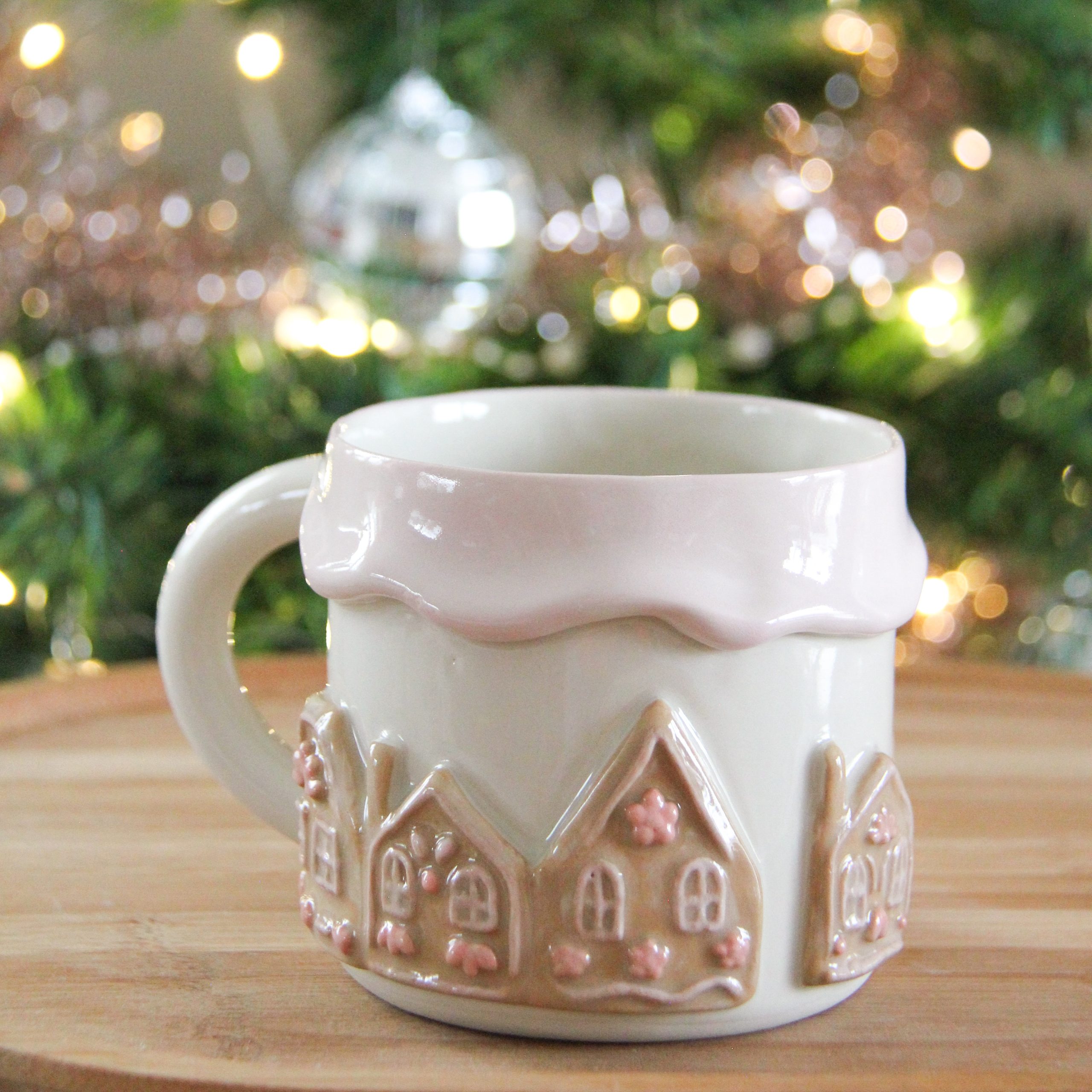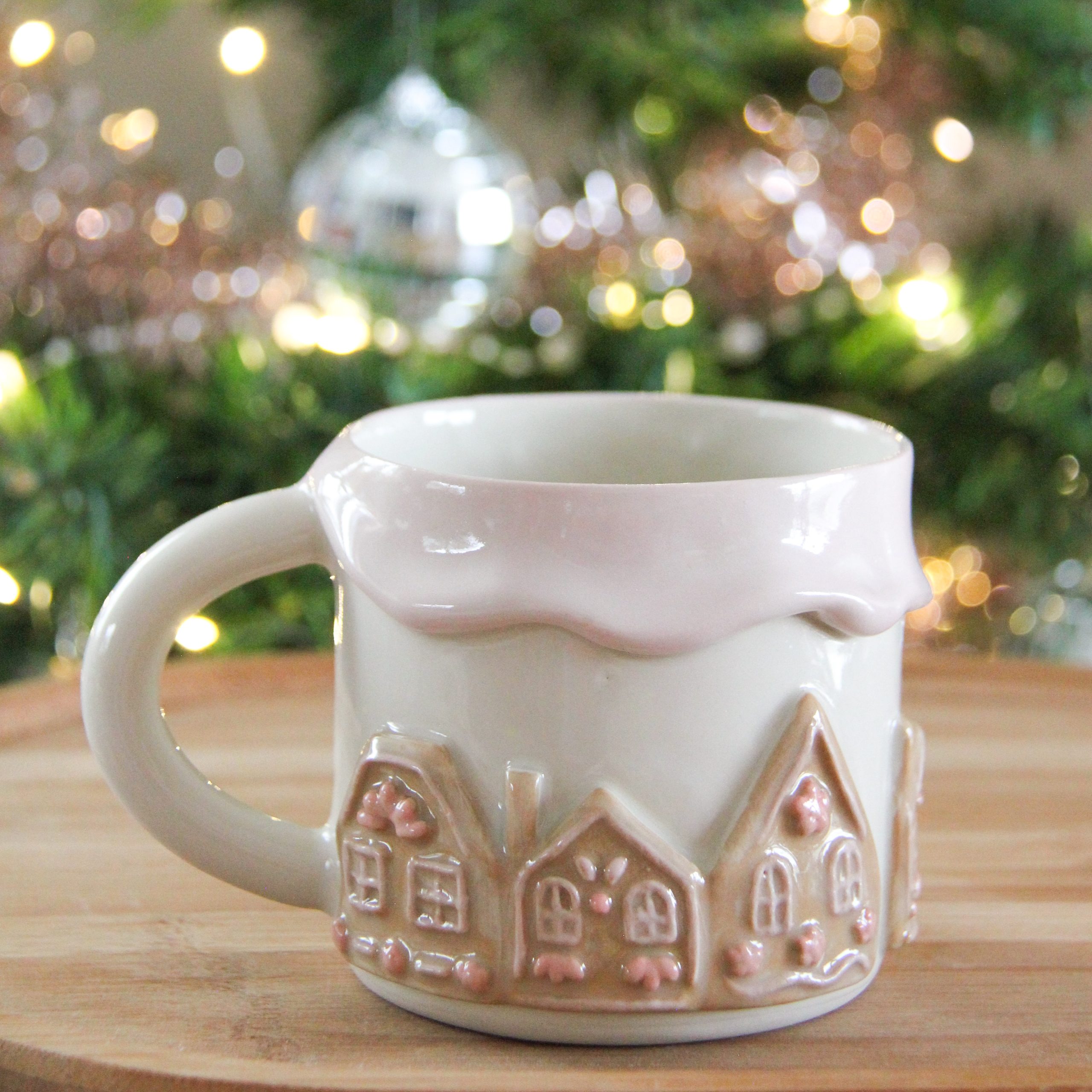 Cette grande tasse en grès a été réalisée à la main avec différentes techniques de moulage et modelage. Les maisons en pain d’épices ont été déposées à la main sur la tasse puis peintes ce qui rend chaque pièce unique. Elle a été cuite une première fois, puis une deuxième fois où elle est recouverte d’émail. Cette dernière étape va permettre à la pièce d’être étanche.