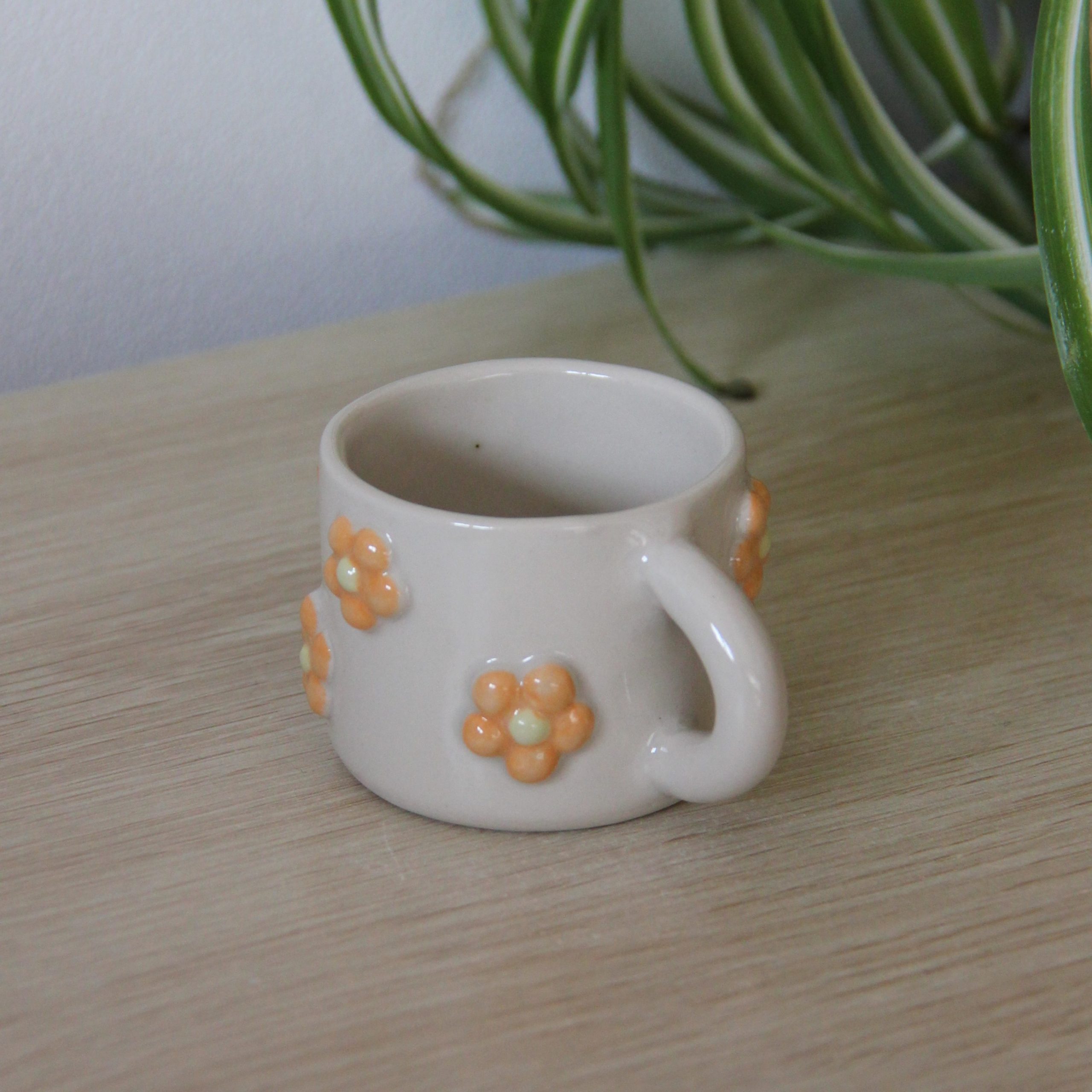 Cette petite tasse expresso en grès a été réalisée à la main avec différentes techniques de moulage et modelage. Les petites fleurs ont été déposées une à une sur la tasse puis peintes ce qui rend chaque pièce unique. Elle a été cuite une première fois, puis une deuxième fois où elle est recouverte d’émail. Cette dernière étape va permettre à la pièce d’être étanche.